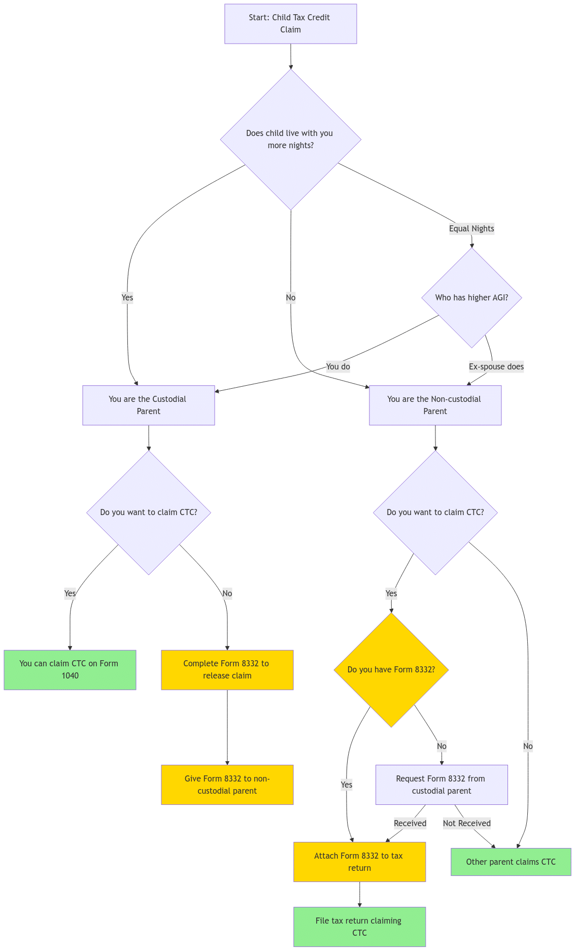 The IRS has specific rules for determining who can claim the CTC when parents are divorced or separated. In most cases, the custodial parent is entitled to the credit. This is the parent with whom the child lived for the greater number of nights during the year.
