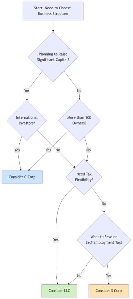 Use this flowchart as a quick guide to determine which business structure might be most appropriate for your situation. While this provides a good starting point, remember to consider all factors and consult with professionals before making your final decision.Understanding C Corporations