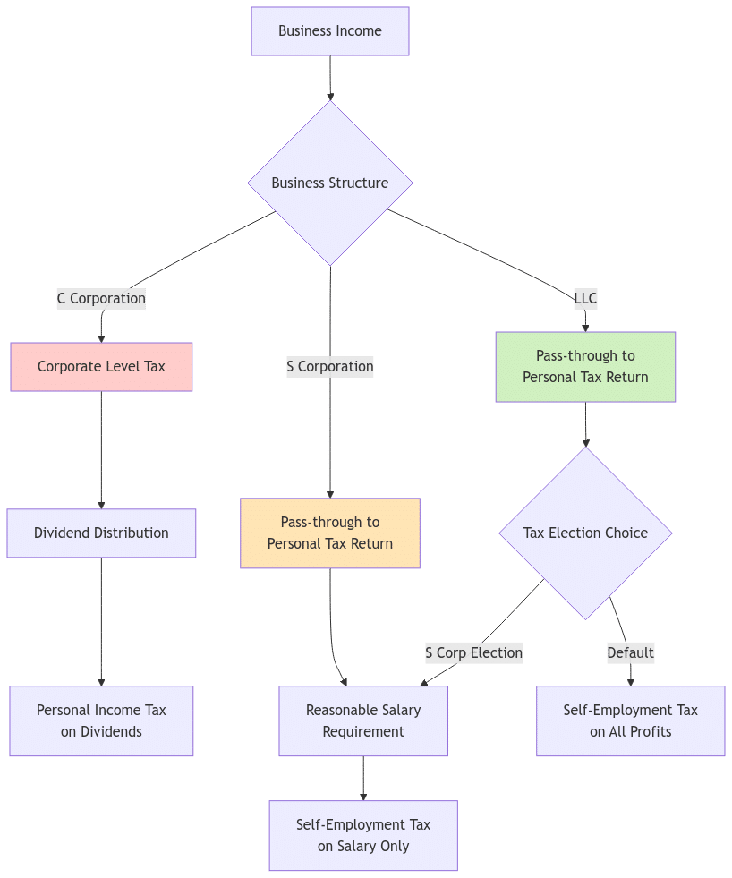 This flowchart illustrates how income flows through different business structures and its tax implications. Understanding these paths is crucial for making an informed decision about your business structure and planning for tax efficiency.Real-World Examples