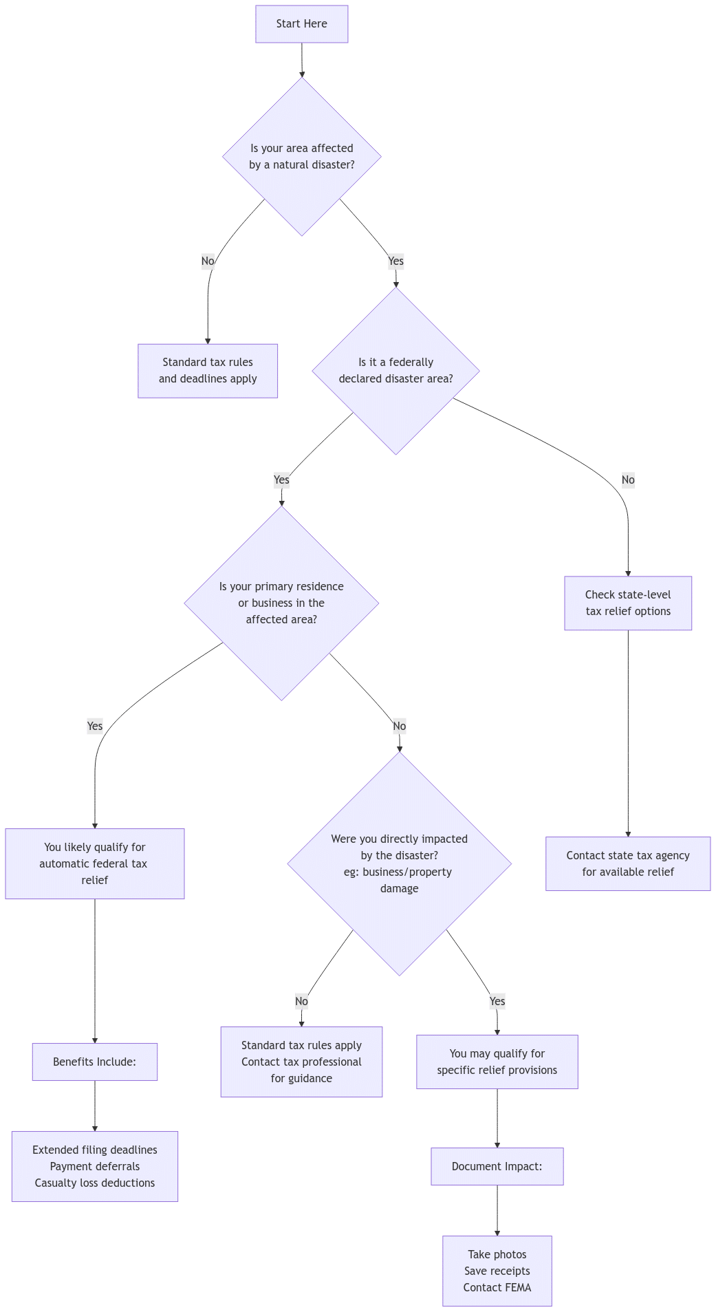 - The IRS offers automatic tax relief for those in federally declared disaster areas: Deadlines for filing and payments have been extended, varying by location and disaster.