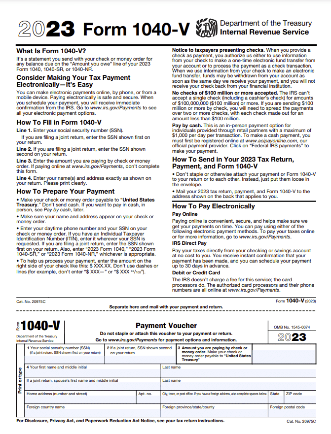 Think of Form 1040-V as a payment voucher. It’s a simple form you include when you’re sending a check or money order to the IRS to cover your tax liability. You’ll need this form if you’re making a payment with any of the following tax returns: