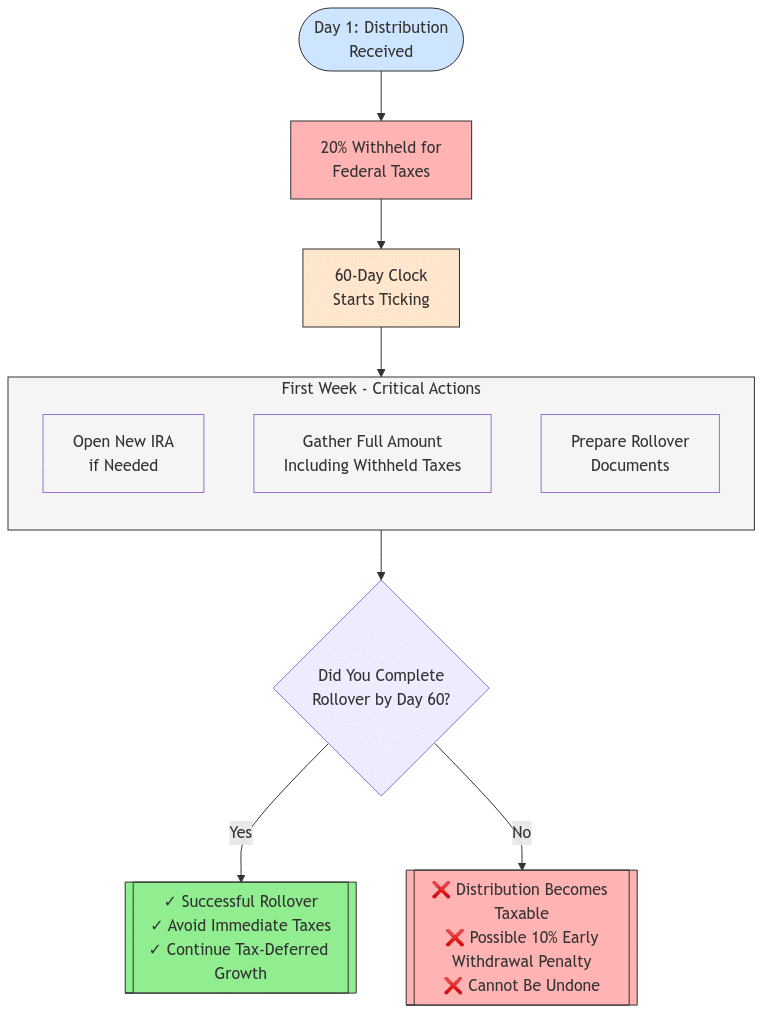 This rule gives you 60 days to deposit your lump sum distribution into an IRA to avoid taxes. Miss the deadline, and the distribution becomes taxable and possibly subject to penalties.