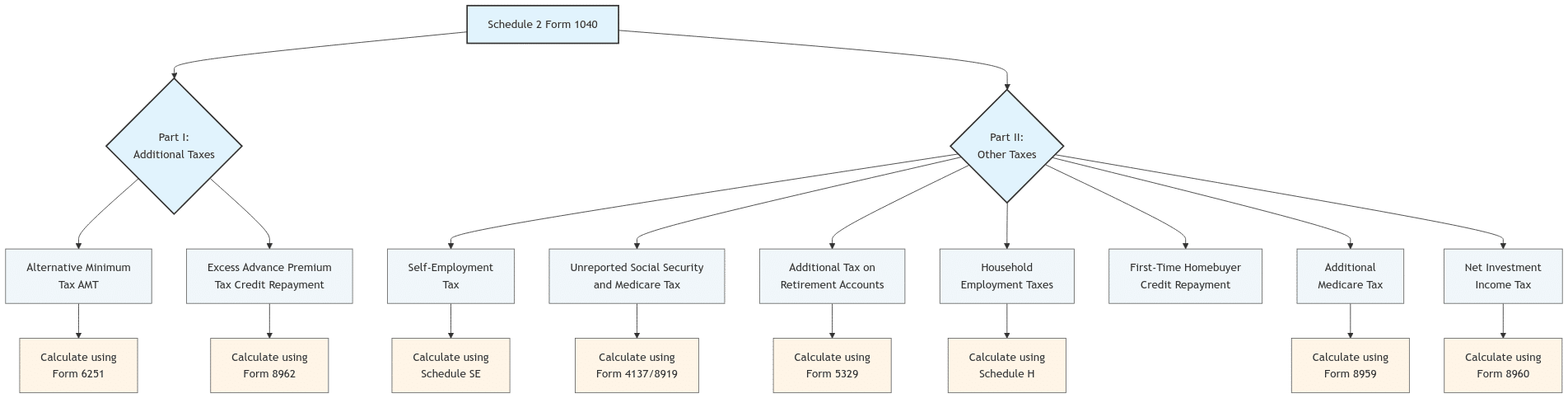 - Schedule 2 covers Alternative Minimum Tax (AMT), self-employment tax, and other specific tax situations.
