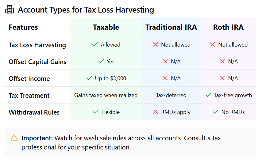 - Taxable Brokerage Accounts: This is where tax loss harvesting is most effective. Losses realized in taxable accounts can directly offset both capital gains and ordinary income.
