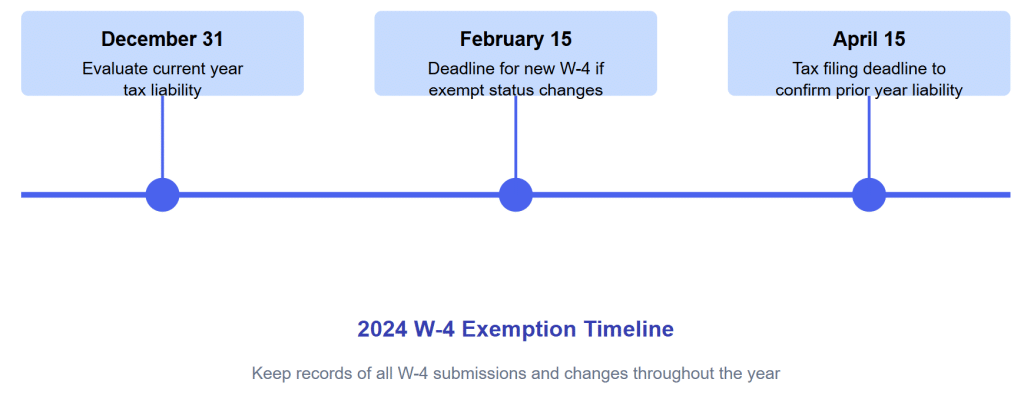 - February 15: Deadline for new W-4 if exempt status no longer applies